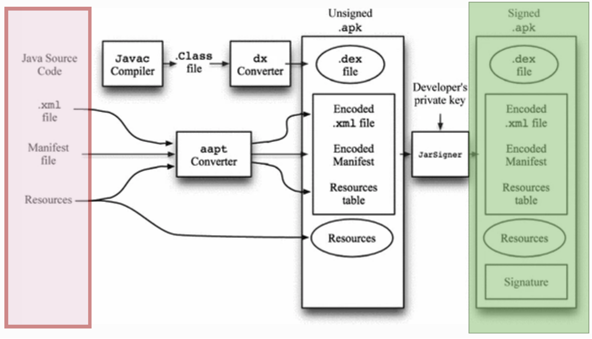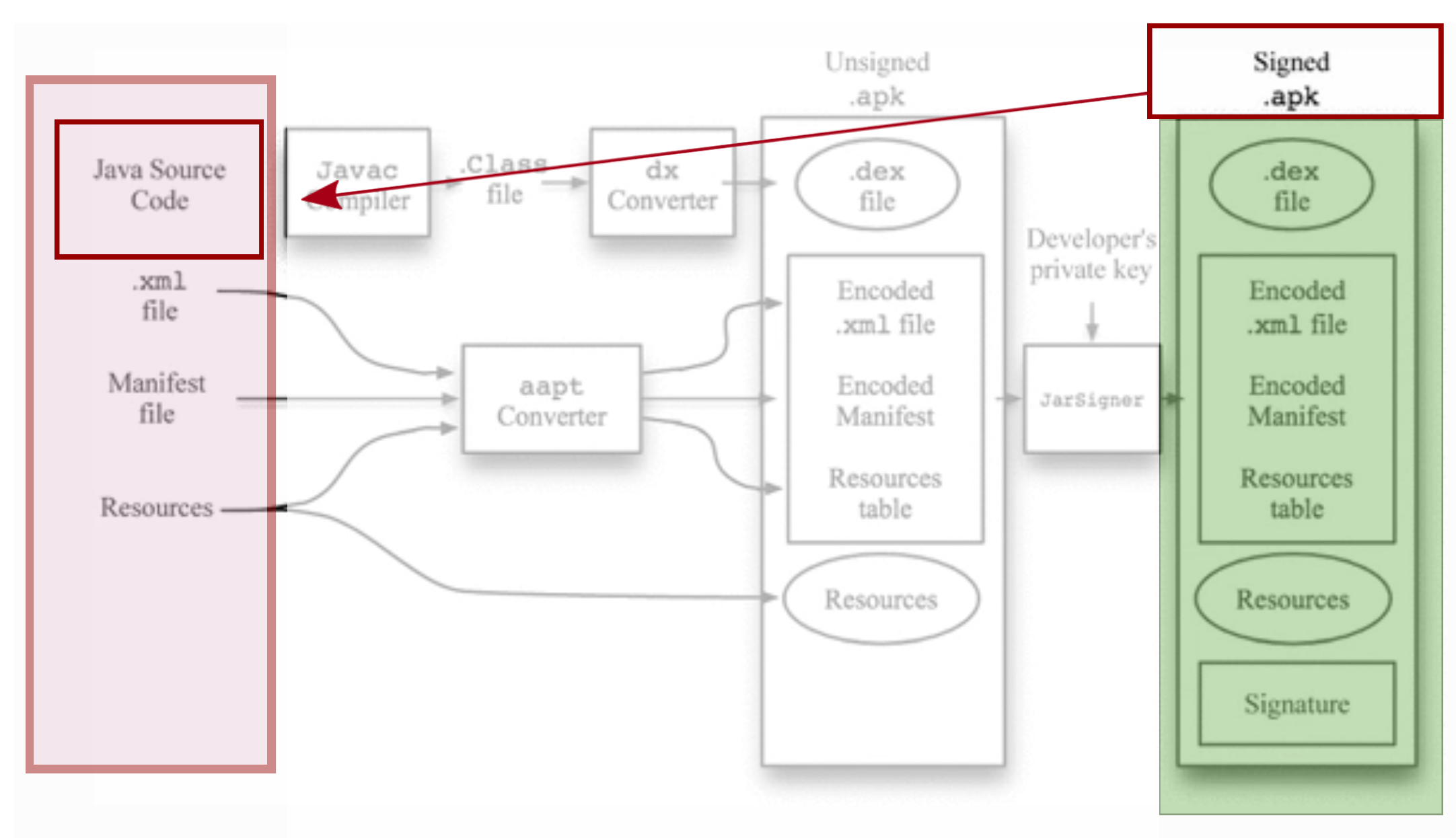 Cuando se desarrolla una aplicación se crea el código de la misma y luego de una serie de pasos se la compila en un binario .apk firmado por le desarrolladorx.