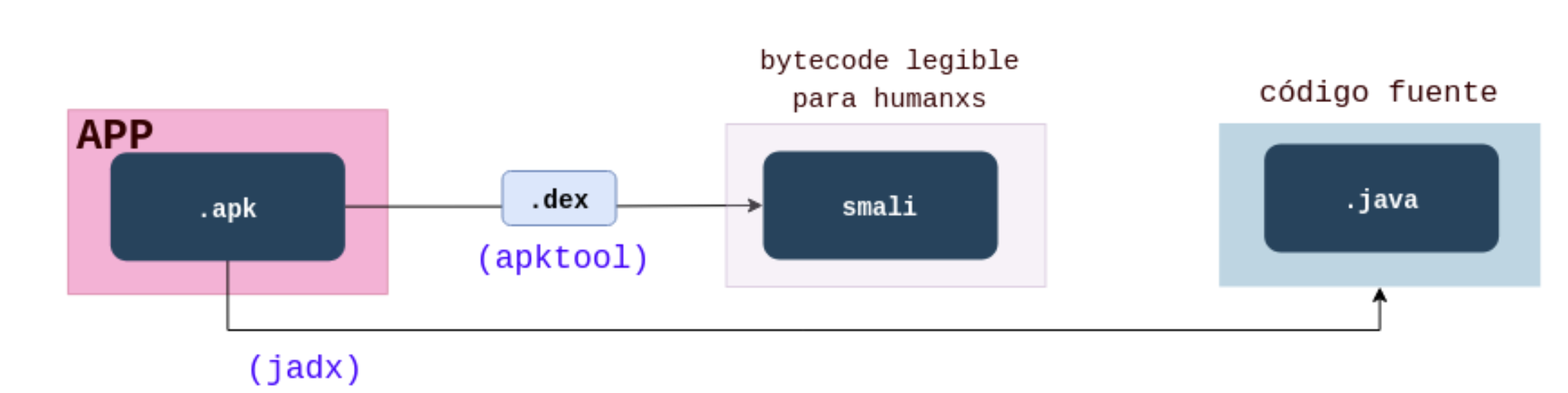 Dado que nosotrxs contamos con el binario solamente, tenemos que lograr el proceso inverso: a partir del apk obtener una versión del código fuente de la aplicación.