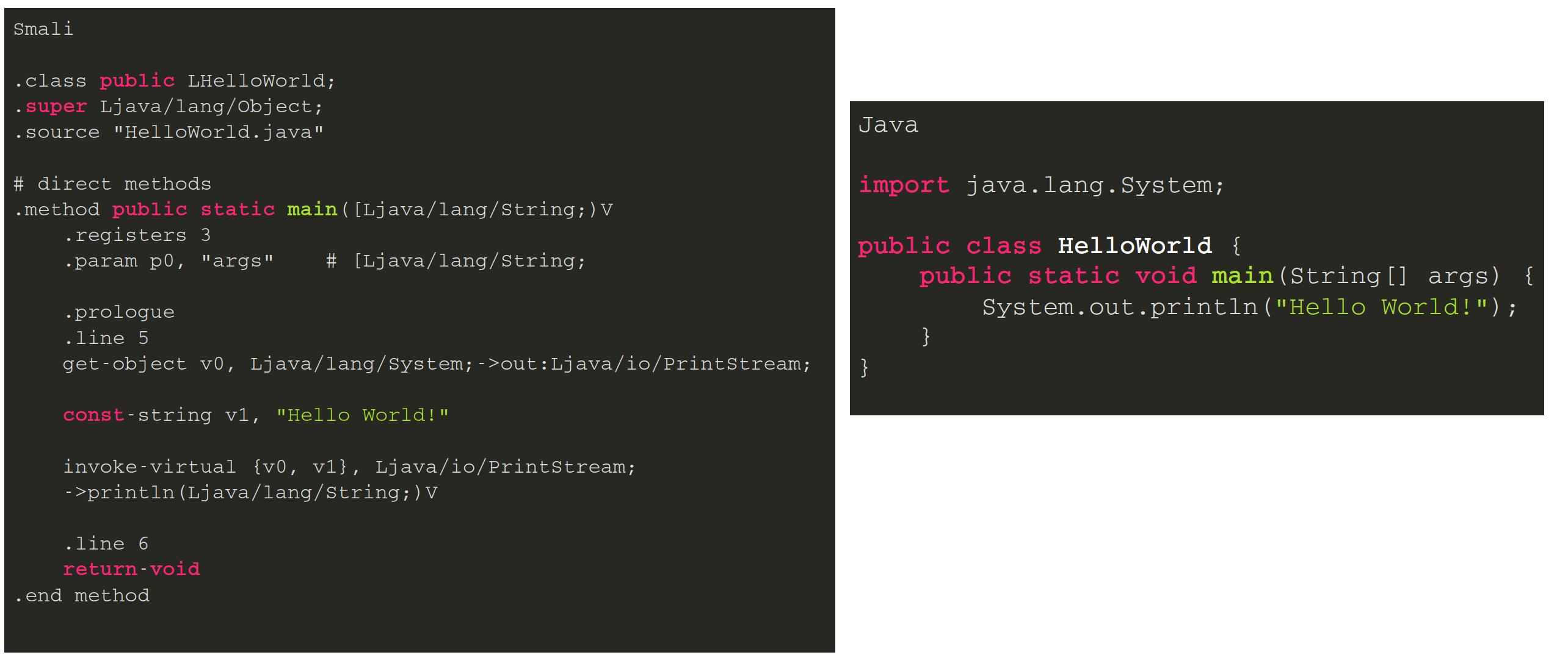 Como se observa en la ilustración una primera estrategia podrá ser utilizar la herramienta apktool para obtener el código smali de la aplicación. El smali es similar al código assembly de un binario en GNU/Linux. Una segunda estrategia será utilizar la herramienta jadx para obtener directamente el código java. Comparando ambos resultados de la decompilación se podrá inferir que la segunda estrategia nos devuelve un código más humanamente legible.