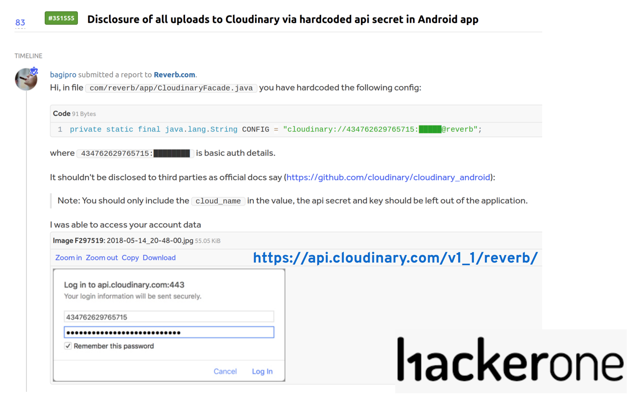 El siguiente es un ejemplo que unx investigadorx bajo el nombre de bagipro reportó a la plataforma Hackerone, luego de conseguir una filtracion de archivos por una apikey hardcodeada en el código decompilado de una aplicación. El reporte se puede leer completo en: https://hackerone.com/reports/351555