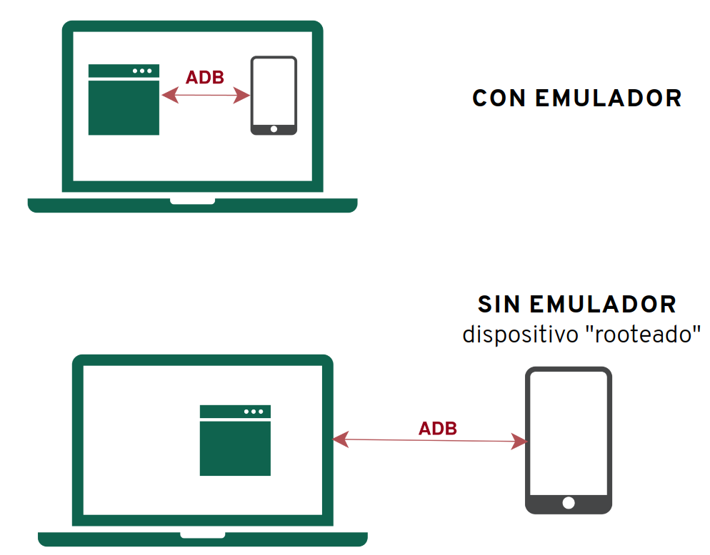 La comunicación entre la máquina de análisis y el emulador se da con Android Device Bridge (ADB):