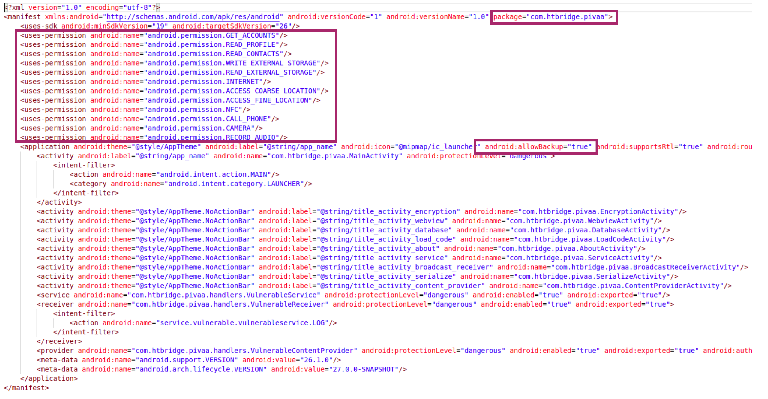 Usando jadx-gui podemos ver de manera simple el Manifiesto de una aplicación como PIVAA por ejemplo.