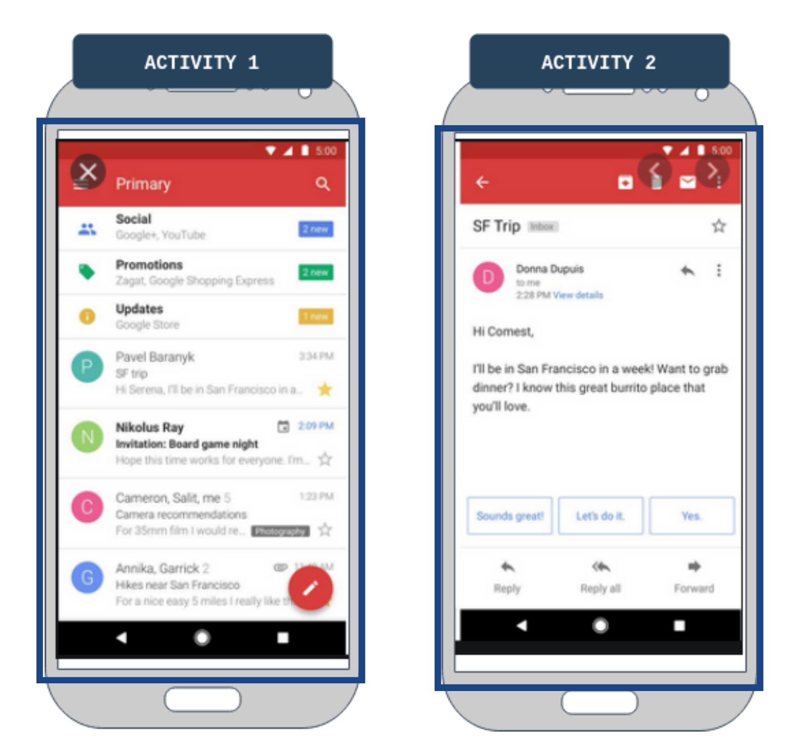 Activities: un activity es el código que corresponde a una pantalla con una interfaz de usuarie. Se llama Activity al código asociado a una actividad de le usuarie como mandar un mail o sacar una foto.