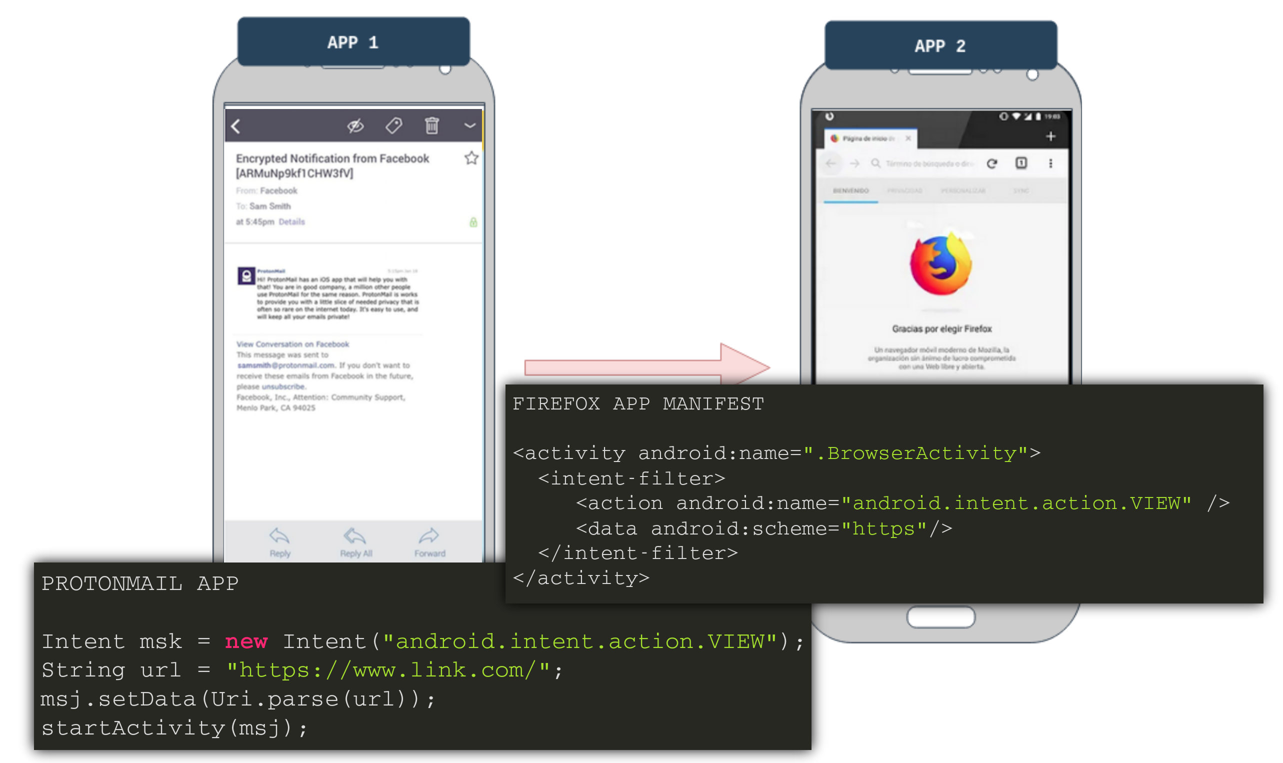 Esta otra ilustración ejemplifica cómo una aplicación de correo electrónico despliega un hipervínculo dentro de un email, que al ser presionado por le usuario hace que esa aplicación envié un Intent solicitando visualizar una página web. Esta intención es recibida por el navegador que le usuarie tiene instalado en su dispositivo, en este caso Firefox Mozilla será el encargado de navegar a esa página web.