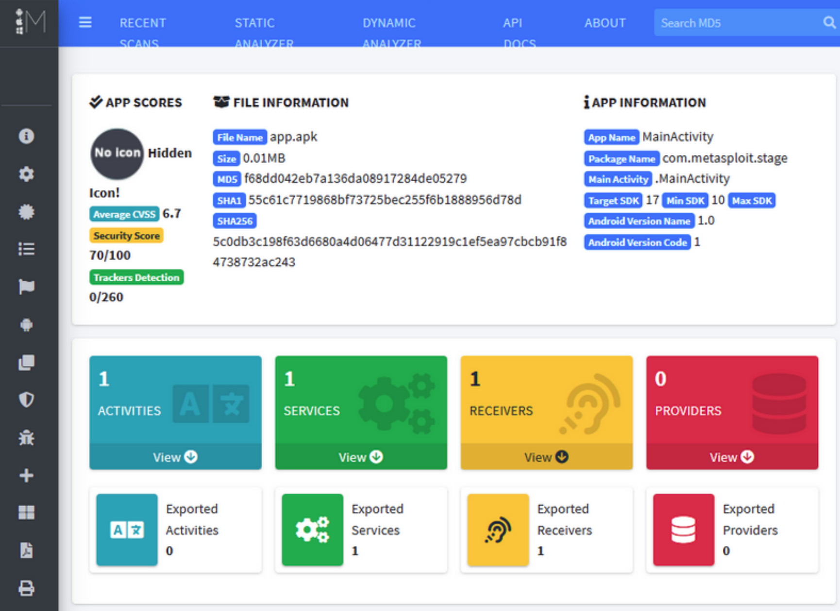 Existen numerosas herramientas para hacer análisis de aplicaciones. Una de la más conocida es el “Mobile Security Framework” (MobSF) es una herramienta para el análisis automatizado de aplicaciones móviles (https://mobsf.github.io/docs/#/). Analiza apps de Android y iOS y cuenta con mon módulos de análisis de malware y otros vinculados a análisis de seguridad más específicos. Asímismo, permite hacer análisis estático del código del apk y análisis dinámico.
