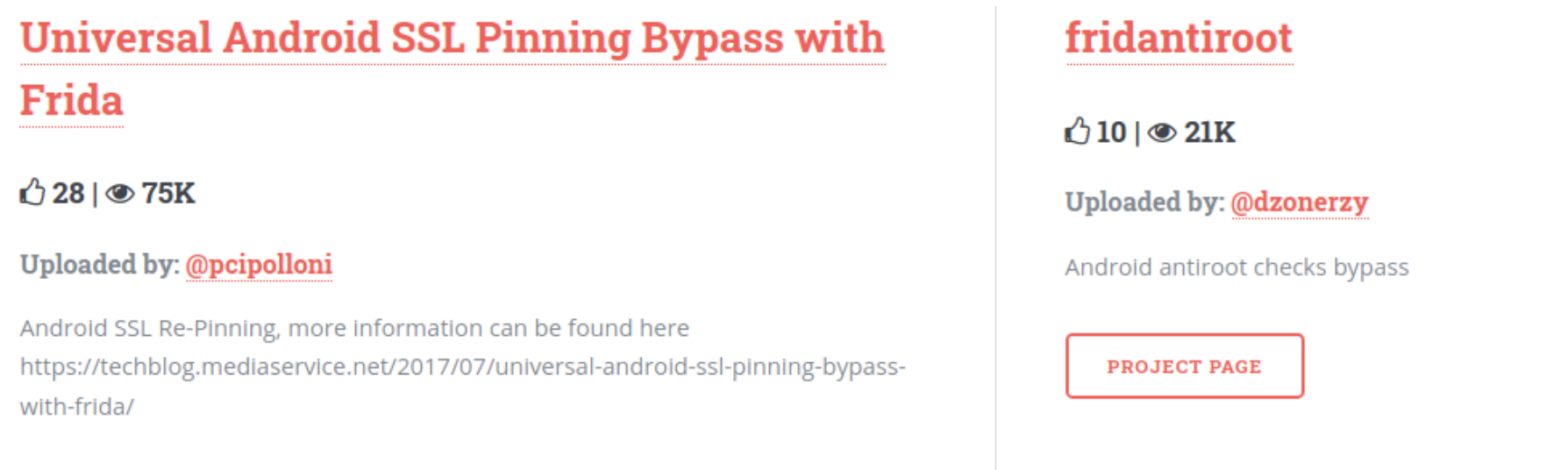 Existen scripts de Frida, disponibles publicamente en https://codeshare.frida.re/ que se ocupan de implementar bypasses a las implementaciones más comunes de SSL pinning.