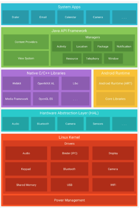 Kernel con Androidismos (IPC, manejo de memoria, logging específicos de Android) + android runtime + software stack (GUI environment & frameworks). Más información en: https://developer.android.com/guide/platform